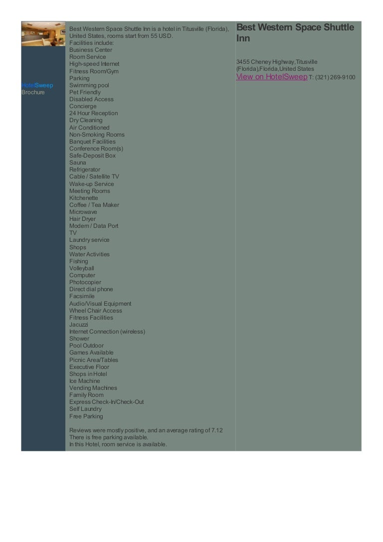 See more of best western space shuttle inn on facebook. The best western international highlights above are subject to change without notice. Property location when you stay at best western space shuttle inn in titusville, you'll be close to st. Quench your thirst with your favorite drink at a bar/lounge. You can call at +1 321 269 9100 or find more contact information.
